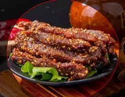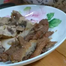 3.腌制好的肉片从酱汁里捞出,放到干净的盘子里在阴凉的地方晾一下,但不能放到阳光下晒,晾干的程度为酱汁在肉片上形成一层肉膜为宜。腌好肉片的酱汁千万不要倒掉,放好下面要用!