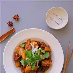 5.把炸好的肉片放到烧沸的卤汁里煮,煮熟为止。喜欢吃烂一点的朋友可增加时间。卤汁的佐料有姜片、大葱、花椒、八角、小茴香、香沙、桂皮、良姜等。卤汁的作法:将炒锅烧热,倒入食用油把油烧热放入切好的姜片、大葱、花椒、八角用热油炝一下然后将腌制肉片剩下的酱汁倒入锅里熬一下(如果剩下的酱汁不够用可继续添加老抽和白糖),沸腾后加入适量的水和香沙、桂皮、良姜等佐料将卤汁烧热后就可以放入炸好的肉片煮熟了。