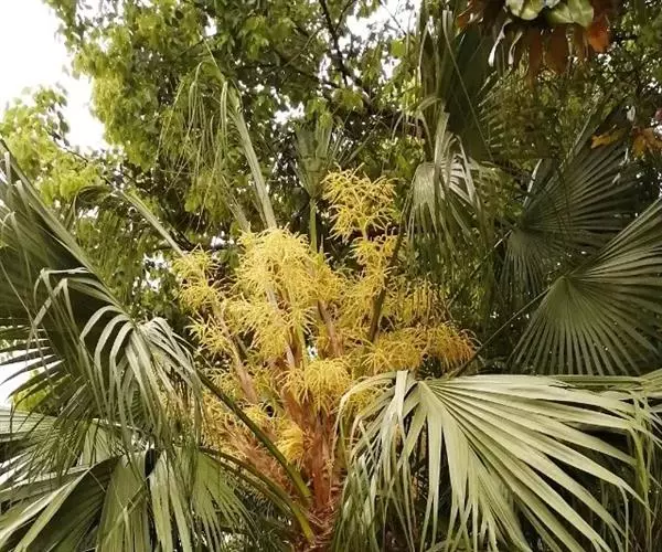 乔木状,高5-20米,直径20-30厘米,基部常膨大。叶阔肾状扇形,直径达1米余,掌状深裂至中部,裂片线状披针形,基部宽4-4.5厘米,顶部长渐尖,2深裂成长达50厘米的丝状下垂的小裂片,两面绿色;叶柄长;1-2米,下部两侧有黄绿色(新鲜时)或淡褐色(干后)下弯的短刺。