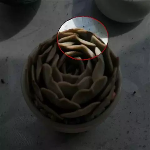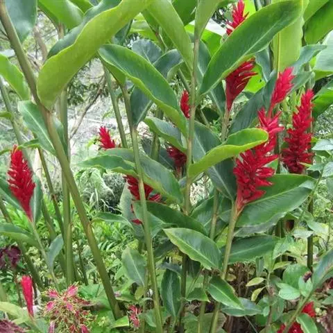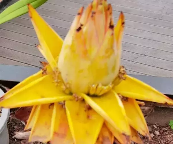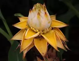 花序直立,直接生于假茎上,密集如球穗状,长20-25厘米,苞片干膜质,黄色或淡黄色,有花2列,每列4-5花;合生花被片卵状长圆形,先端具5 (3+2) 齿裂,离生花被片先端微凹,凹陷处具短尖头。