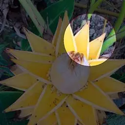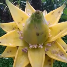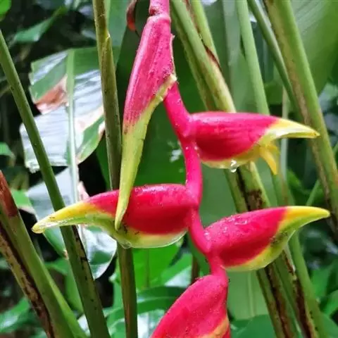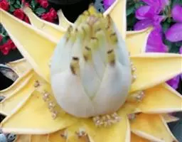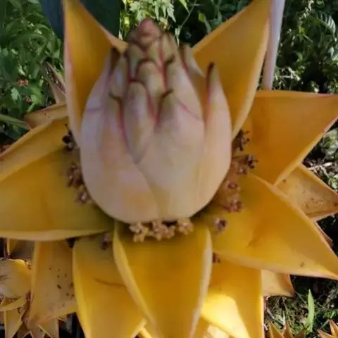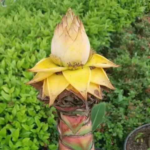 紫苞芭蕉形如一枝亭亭玉立、含苞待放的荷花,但却开在高高的芭蕉树上,这就是紫苞芭蕉。