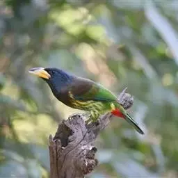 黑眉拟啄木鸟体色艳丽,善于鸣叫,以野果为食,有益植物的扩散。