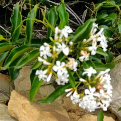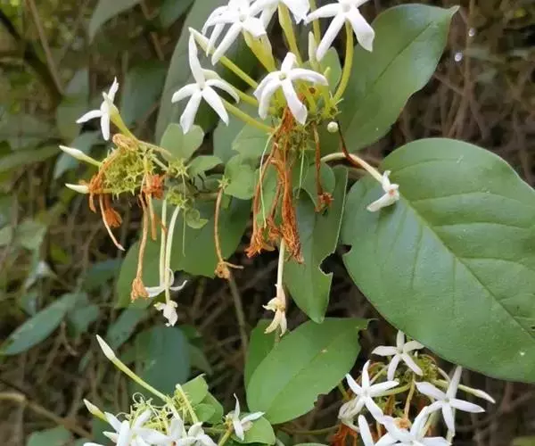 复聚伞花序常排列呈圆锥状,顶生或腋生,有花多朵,密集;苞片线形,长1-5毫米;花梗短或无,果时增,粗增长,无毛或密被毛;花芳香;花萼筒状,光滑或被短柔毛,果时增大,萼齿三角形,不明显,或几近截形;花冠白色,高脚碟状,花冠管纤细,长1.7-3.5厘米,裂片4-5枚,披针形、椭圆形或长圆形,长5-10毫米,宽3-7毫米,先端钝或锐尖;花柱异长。
