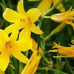 5、小黄花菜H.minor :高30~60cm。叶绿色,长约50cm,宽6cm。着花2~6朵,黄色,外有褐晕,长5~10cm,有香气。傍晚开花。花期6~9月,花蕾可食用。