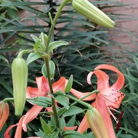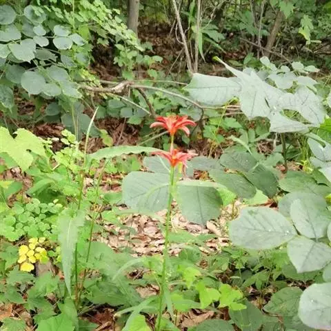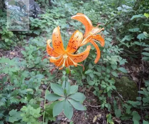 东北百合(Lilium distichum Nakai),别名卷莲花、老哇芋头、轮叶百合、伞蛋花、山丹花,为百合科、百合属多年生球根花卉。鳞茎卵圆形,白色,有节。苞片叶状,花淡橙红色,具紫红色斑点;花被片稍反卷,蒴果倒卵形,花期7-8月,果期9月,具有重要的观赏应用价值。中国东北有分布。