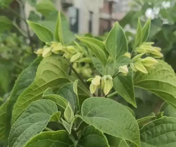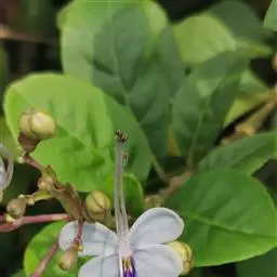 伞房状聚伞花序顶生或腋生,通常二歧分枝,疏散,末次分枝着花3朵,花序长8-18厘米,花序梗长3-6厘米,多少被黄褐色柔毛或无毛;苞片叶状,椭圆形,早落;花萼蕾时绿白色,后紫红色,基部合生,中部略膨大,有5棱脊,顶端5深裂,裂片三角状披针形或卵形,顶端尖;花香,花冠白色或带粉红色,花冠管细,长约2厘米,顶端5裂,裂片长椭圆形,长5-10毫米,宽3-5毫米;雄蕊4,花丝与花柱同伸出花冠外;花柱较雄蕊短,柱头2裂。核果近球形,径6-8毫米,包藏于增大的宿萼内,成熟时外果皮蓝紫色。花果期6-11月。