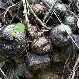 黄独的块根形状只有圆球形和近似圆锥形。一棵植株地下只能长一个块根,而地上的藤上倒能结很多圆球形的种球。