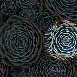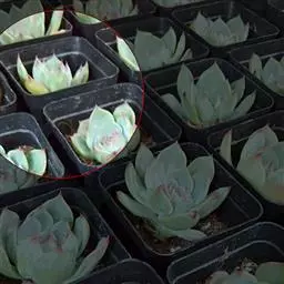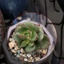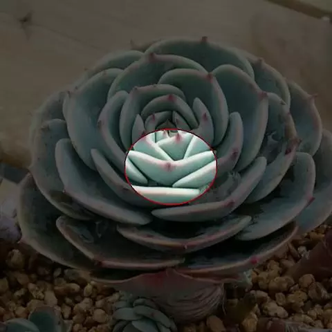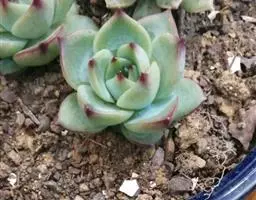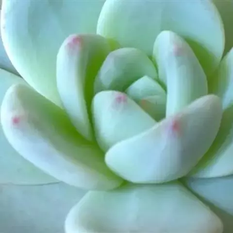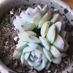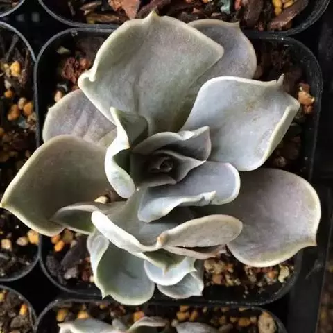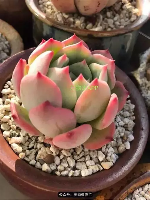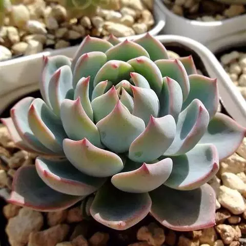 吉玛利亚,中小型品种,植株莲座型紧密排列,叶肥厚倒卵形,叶尖急尖,略披薄粉,叶色粉青到粉蓝,叶尖叶缘易变红,出状态时植株粉嫩, 叶缘叶背多出变红。