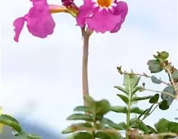 厚萼凌霄栽植前应对植株进行修剪,对主藤进行轻短截,主藤上着生的侧枝全部疏除,主藤萌发新枝后,在其上选择一个长势最壮、靠顶端较近的枝条做主藤的延长枝。待主藤延长枝长到一定高度后应及时搭设攀缘物进行牵引,使其尽早攀缘至棚架顶端,第二年早春对主藤延长枝进行轻短截,促发侧枝。主藤延长枝每侧保留3-4个侧枝,侧枝大致呈“丰”字形分布,第三年对侧枝进行轻短截,促生二级侧枝。按此方法修剪,再加上充足的水肥管理,藤蔓可很快铺满棚架。此后的修剪应着重对过密枝、重叠枝、病虫枝、干枯枝进行疏除,且勿使枝条重叠,否则会影响植株通风透光,引发病虫害。