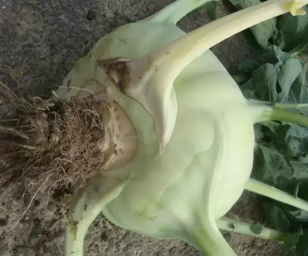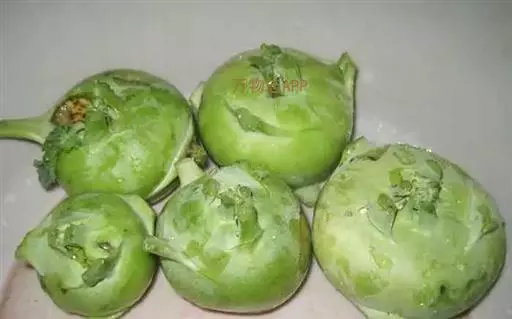 二年生草本,高30-60厘米,全体无毛,带粉霜。茎短,在离地面2-4厘米处处膨大成1个实心长圆球体或扁球体,绿色,其上生叶。