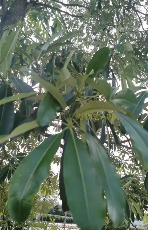 叶3-8片轮生,倒卵状长圆形、倒披针形或匙形,稀椭圆形或长圆形,长7-28cm,宽2-11cm,无毛,顶端圆形,钝或微凹,稀急尖或渐尖,基部楔形;侧脉每边25-50条,密生而平行,近水平横出至叶缘联结;叶柄长1.0-2.5cm。