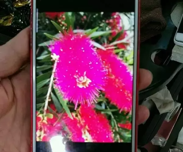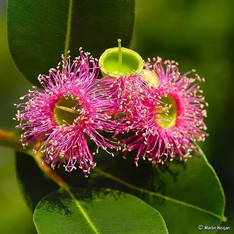 穗状花序生于枝顶;萼管略被毛,萼齿半圆形,近膜质;花瓣绿色,卵形,长6毫米,宽4.5毫米,有油腺点;雄蕊长2.5厘米,鲜红色,花药暗紫色,椭圆形;花柱比雄蕊稍长,先端绿色,其余红色。
