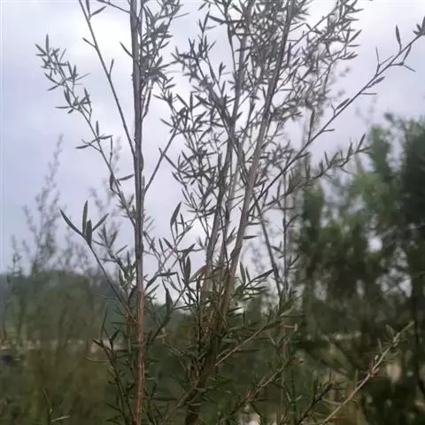 小乔木;树皮坚硬,灰褐色;嫩枝有棱,初时有长丝毛,不久变无毛。叶片坚革质,线形,长5-9厘米,宽3-6毫米,先端尖锐,初时有丝毛,不久脱落,油腺点明显,干后突起,中脉在两面均突起,侧脉明显,边脉位于边上,突起;叶柄极短。