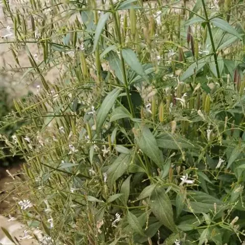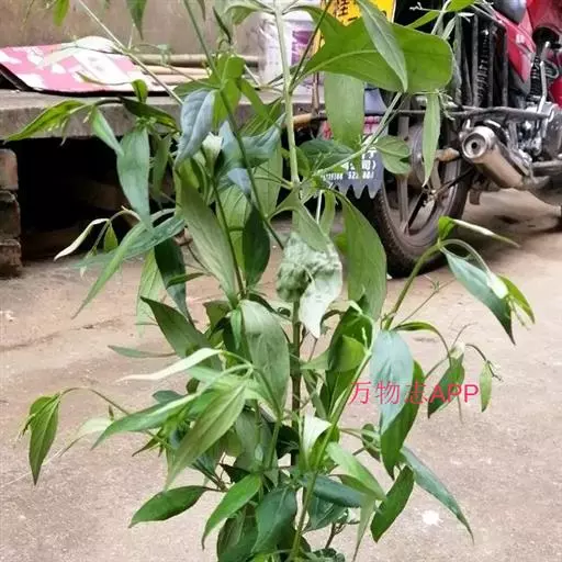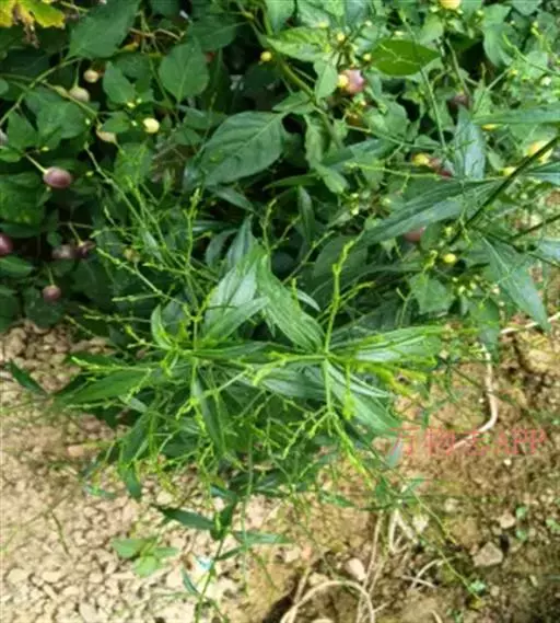 一年生草本。茎高50~80厘米,4棱,下部多分枝,节膨大。叶卵状矩圆形至矩圆状披针形,长4~8厘米,宽1~2.5厘米,顶端略钝。花序轴上叶较小,总状花序顶生和腋生,集成大型圆锥花序;苞片和小苞片微小,长约1毫米;花萼裂片三角状披针形,长约3毫米,有腺毛和微毛;花冠白色而小,下唇带紫色班纹,长约12毫米,外有腺毛和短柔毛,2唇形,上唇微2裂,下唇3深裂,花冠筒与唇瓣等长;雄蕊2,花药2室,一室基部和花丝一侧有柔毛。蒴果扁,中有一沟,长约10毫米,疏生腺毛;种子12粒,四方形,有皱纹。