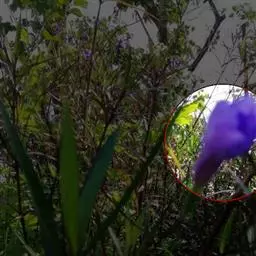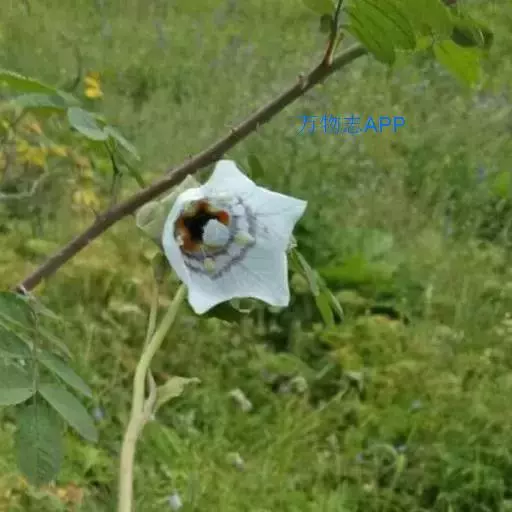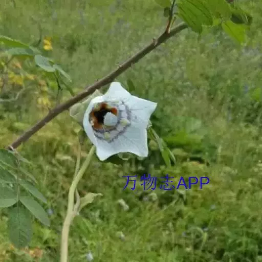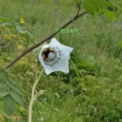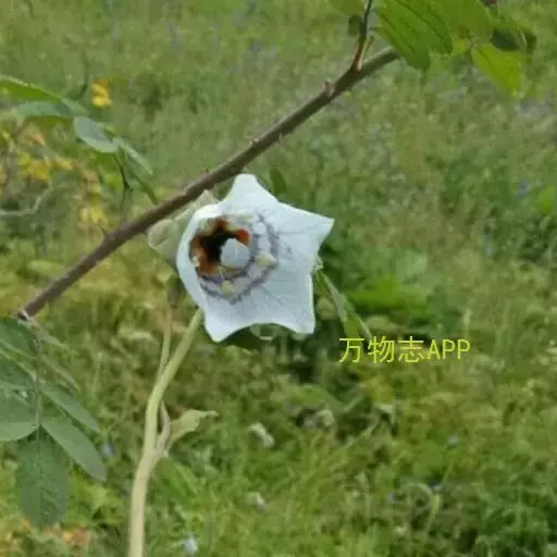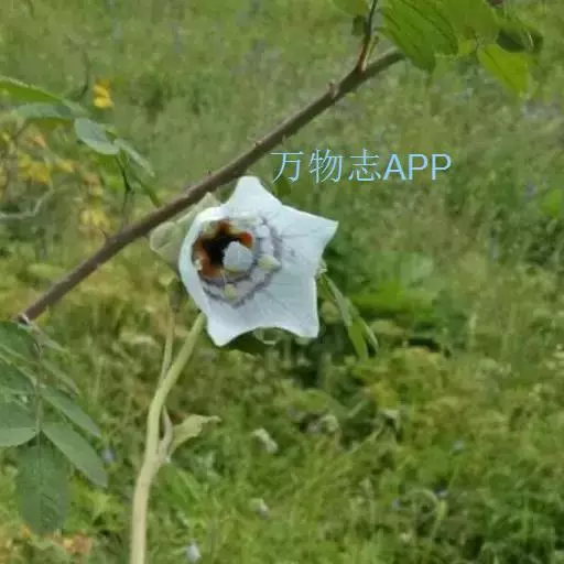 花单生于茎及分枝的顶端;花梗长,灰绿色,疏生短小的白色硬毛;花萼贴生至子房中部,筒部半球状,具10条明显辐射脉,绿色,有白粉,无毛或微被白色硬毛;裂片间湾缺尖狭,紧接,裂片卵形、椭圆形或卵状披针形,顶端急尖,全缘,长约1.5-2厘米,宽约6-8毫米,蓝灰色,无毛或顶端微具短柔毛;花冠阔钟状,长约2.8厘米,直径约2.6厘米,淡蓝色而具深蓝色花脉,内部常有紫斑,无毛;雄蕊无毛,花丝基部微扩大,花药矩圆状,各长约5-6毫米。在蒴果上宿存的花萼裂片极度长大,并向外反卷。