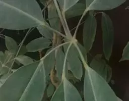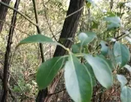 常绿乔木,高约15米,叶、枝及树皮干时几不具芳香气。枝条及小枝褐色,圆柱形,无毛。叶对生或近对生,卵圆形至长圆状卵圆形,长8-11(14)厘米,宽4-5.5(9)厘米,先端锐尖,基部圆形,革质,上面鲜时绿色,干时灰绿色,光亮,下面近同色,晦暗,两面无毛,具离基三出脉,侧脉自叶基约1厘米处生出,近叶片3/4处渐消失或不明显网结,有时近叶缘一侧各有一条附加的侧脉,细脉两面明显,呈浅蜂巢状网结;叶柄长约1.5厘米,腹凹背凸,红褐色或褐色。