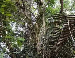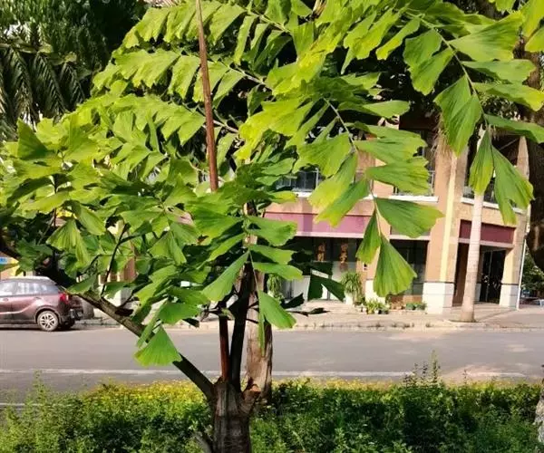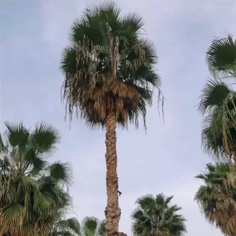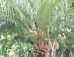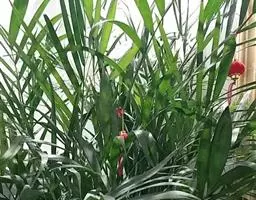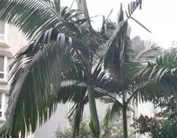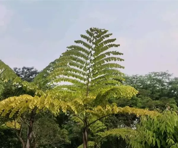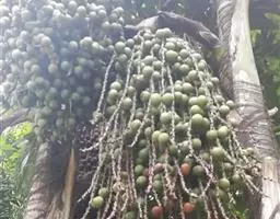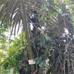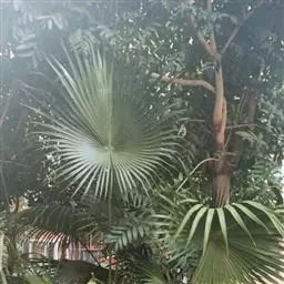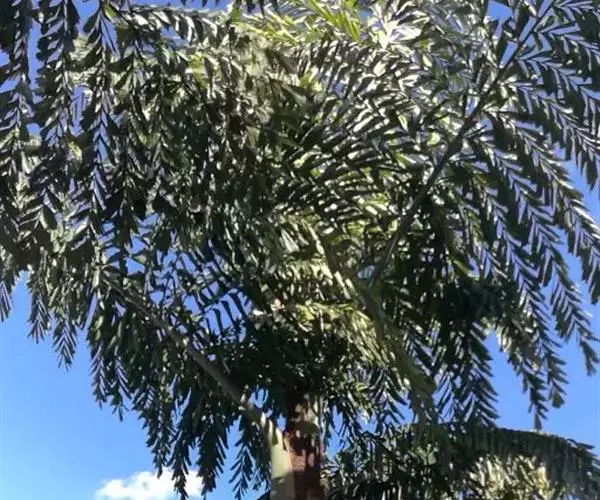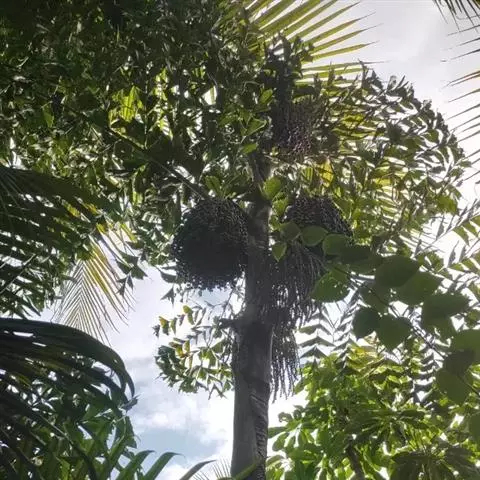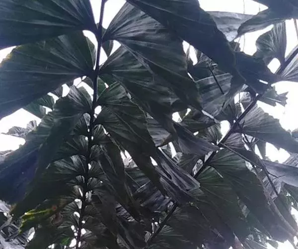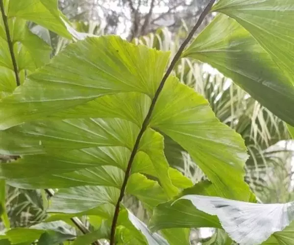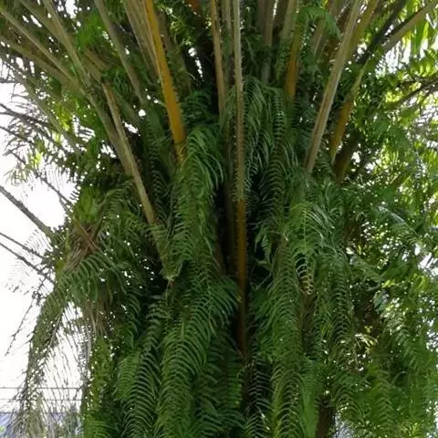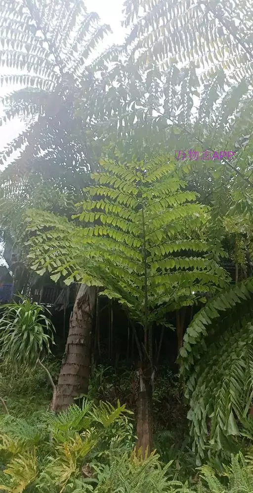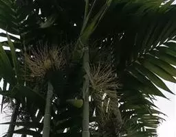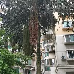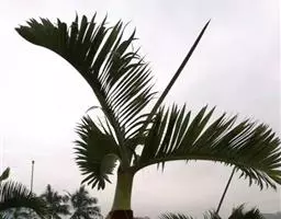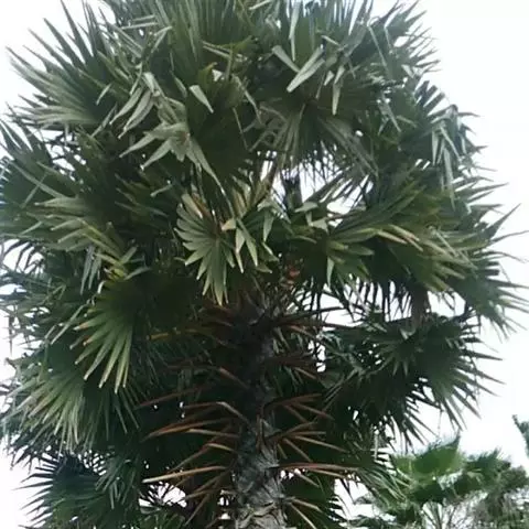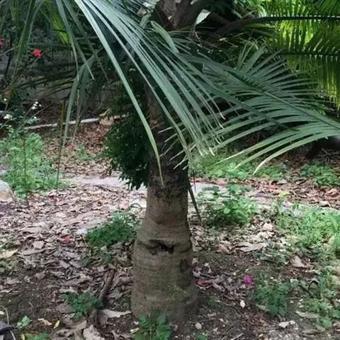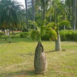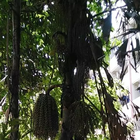 董棕(学名:Caryota urens Linn):乔木状,高5-25米,直径25-45厘米,茎黑褐色,花瓶状,表面不被白色的毡状绒毛,具明显的环状叶痕。叶长5-7米,宽3-5米,弓状下弯;羽片宽楔形或狭的斜楔形,长15-29厘米,宽5-20厘米,幼叶近革质,老叶厚革质;叶鞘边缘具网状的棕黑色纤维。佛焰苞长30-45厘米;花序长1.5-2.5米,具多数、密集的穗状分枝花序,长1-1.8米;雄花花萼与花瓣被脱落性的黑褐色毡状绒毛,萼片近圆形;雌花与雄花相似,但花萼稍宽,花瓣较短。果实球形至扁球形,成熟时红色。种子1-2颗,近球形或半球形。花期6-10月,果期5-10月。
