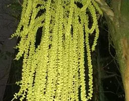 佛焰苞长30-45厘米;花序长1.5-2.5米,具多数、密集的穗状分枝花序,长1-1.8米;花序梗圆柱形,粗壮,直径5-75厘米,密被覆瓦状排列的苞片,雄花花萼与花瓣被脱落性的黑褐色毡状绒毛,萼片近圆形,盖萼片大于被盖的侧萼片,表面不具疣状凸起,边缘具半圆齿,雄蕊(30-)80-100枚,花丝短,近白色,花药线形;雌花与雄花相似,但花萼稍宽,花瓣较短,退化雄蕊3枚,子房倒卵状三棱形,柱头无柄,2裂。