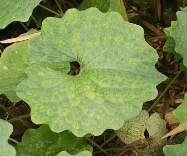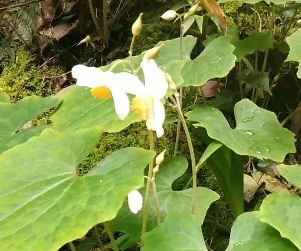 多年生无毛草本,具红黄色液汁。根橙黄色,根茎匍匐。叶全部基生,叶片心形或心状肾形,稀心状箭形,长5-26厘米,宽5-20厘米,先端渐尖或急尖,基部耳垂,边缘呈波状,表面绿色,背面灰绿色,掌状脉5-7条,网脉细,明显;叶柄条形或狭条形,长10-30厘米,带蓝灰色,基部略扩大成狭鞘。花葶灰绿色略带紫红色,高20-40厘米,有3-5花,排列成聚伞状伞房花序;苞片和小苞片卵状披针形,长2-10毫米,先端渐尖,边缘薄膜质;花梗直立,长0.5-5厘米。花芽卵珠形,长约1厘米,先端渐尖;萼片长0.5-1厘米,无毛;花瓣倒卵形,长1-2.5厘米,宽0.7-1.8厘米,白色;花丝长5-7毫米,花药黄色, 长约3毫米;子房卵形或狭卵形,长0.5-1厘米,无毛,花柱长3-5毫米,柱头2裂,下延于花柱上。蒴果狭椭圆形,长约2厘米,宽约0.5厘米,花柱延长达1厘米(果未成熟)。花期3-6月,果期6-10月。