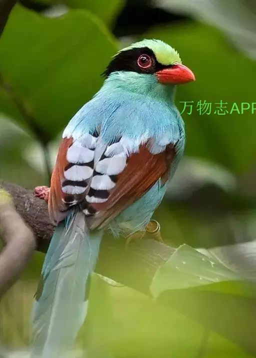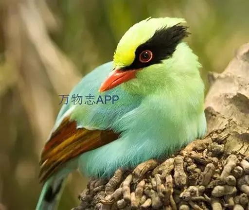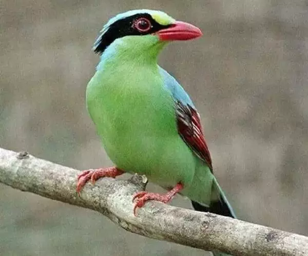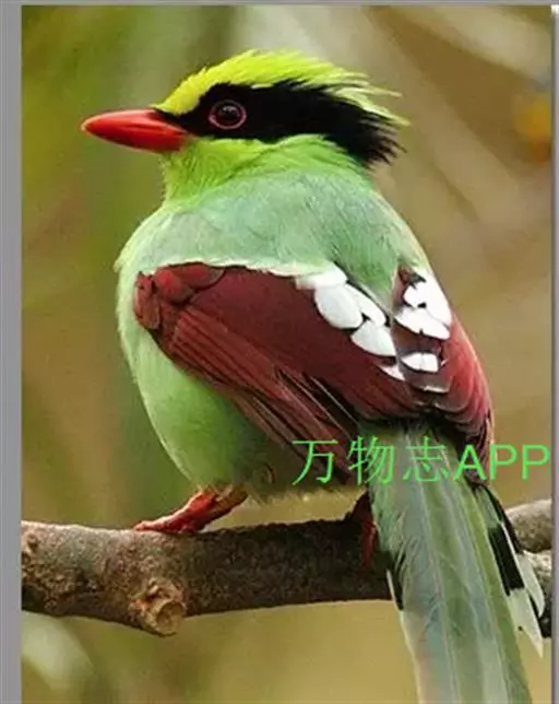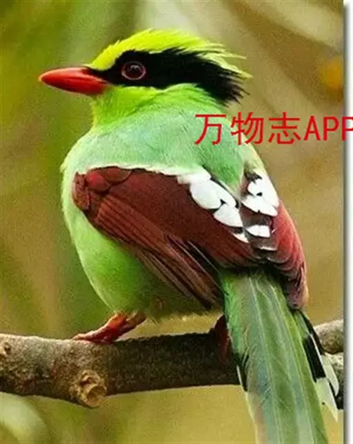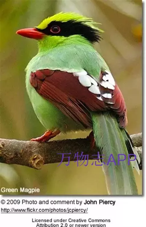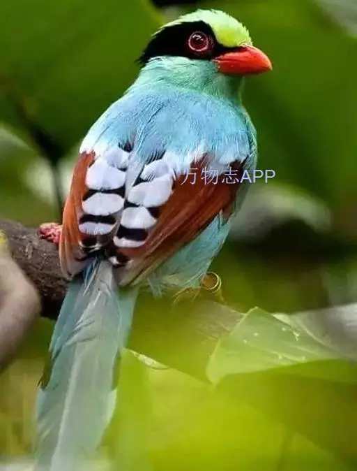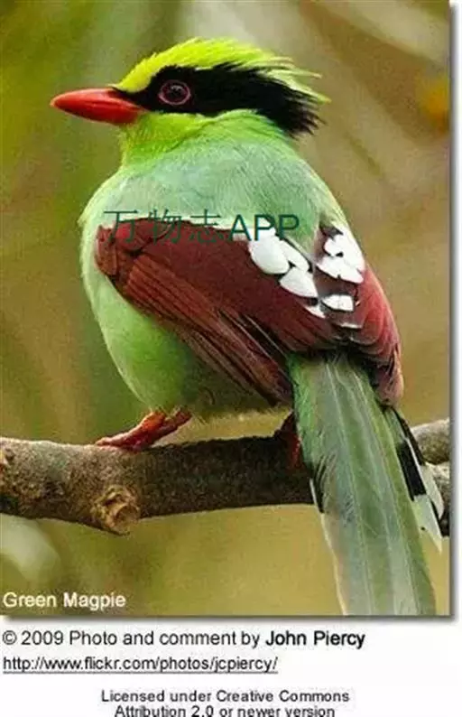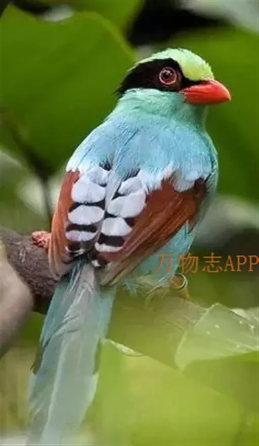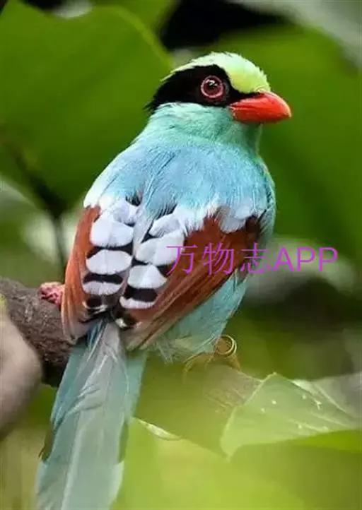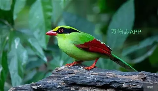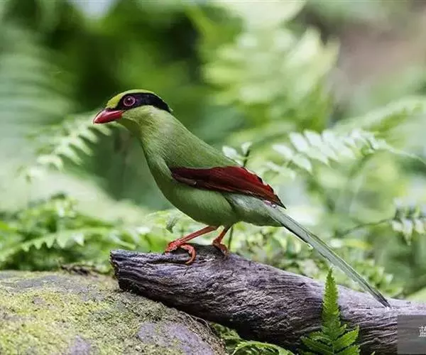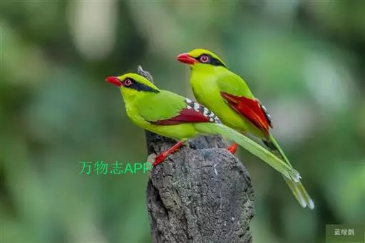 蓝绿鹊(学名:Cissa chinensis):中型鸟类,共有5个亚种。体长36-38厘米。尾长,嘴、脚红色。通体羽色主要为草绿色,宽阔的黑色贯眼纹向后延伸到后颈,在绿色的头侧极为醒目。两翅栗红色,内侧飞羽具黑色次端斑和白色尖端。尾绿色,具黑色次端带斑和白色尖端。