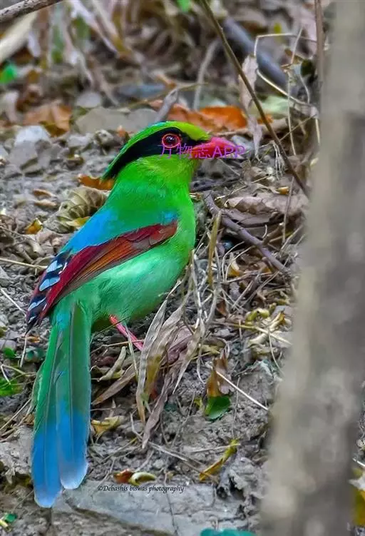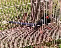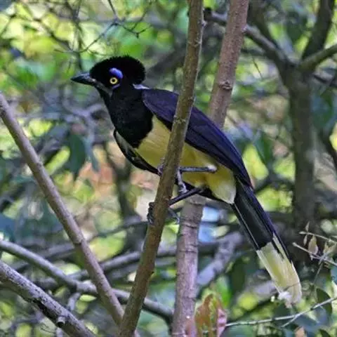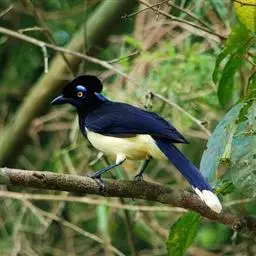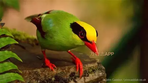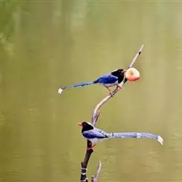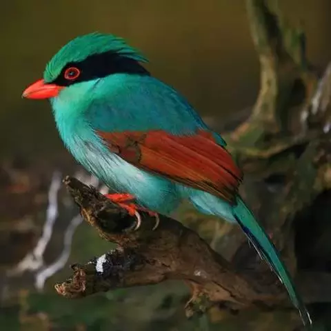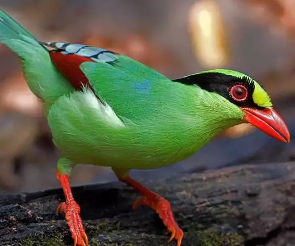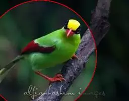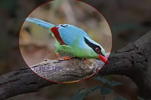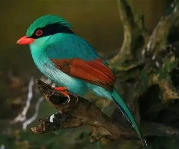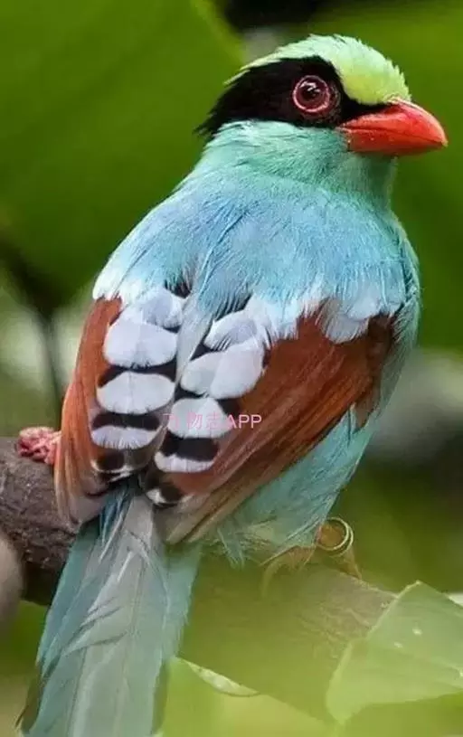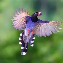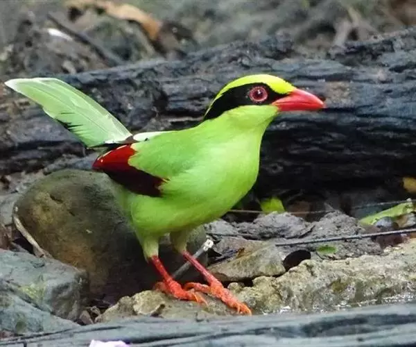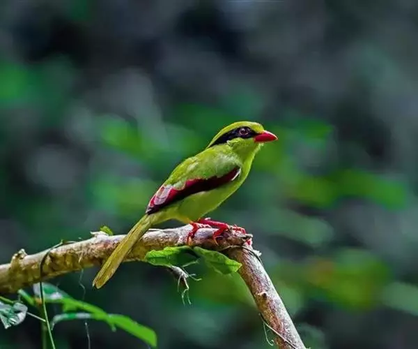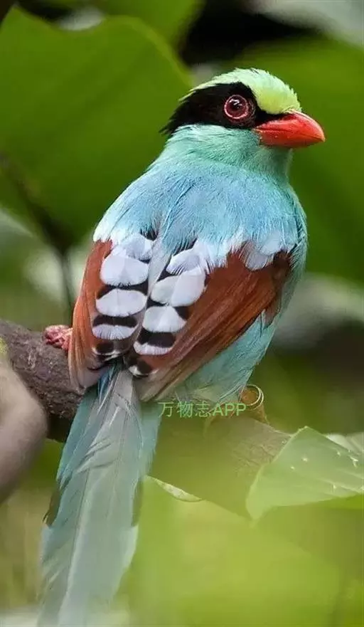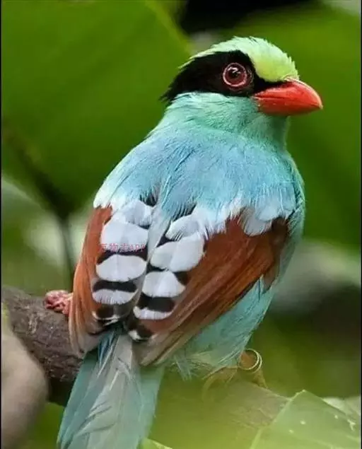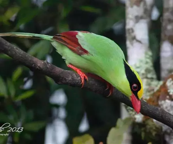 蓝绿鹊(学名:Cissa chinensis):中型鸟类,共有5个亚种。体长36-38厘米。尾长,嘴、脚红色。通体羽色主要为草绿色,宽阔的黑色贯眼纹向后延伸到后颈,在绿色的头侧极为醒目。两翅栗红色,内侧飞羽具黑色次端斑和白色尖端。尾绿色,具黑色次端带斑和白色尖端。