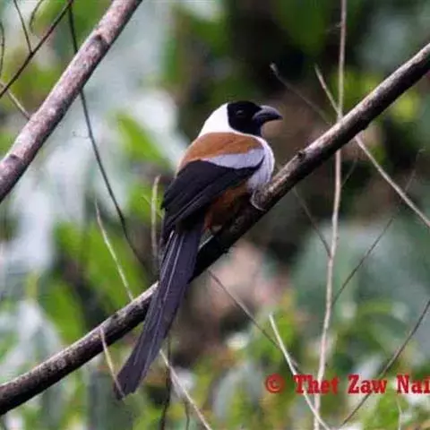 黑额树鹊是雀形目、鸦科的鸟类,体长约38厘米。黑色的尾甚长,上背、背、下腹及尾覆羽棕色。…