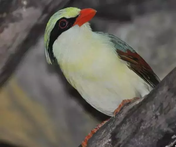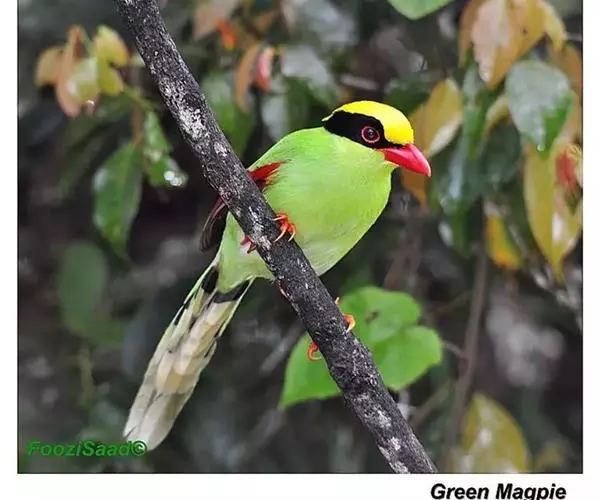 虹膜血红色,嘴、脚红色,爪角红色。与短尾绿鹊的区别在尾较长,头顶多黄色,三级飞羽羽端黑色。