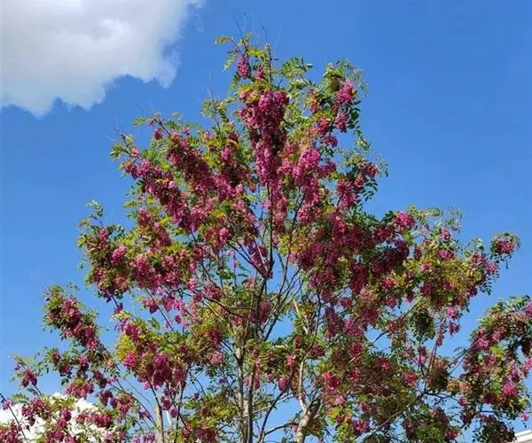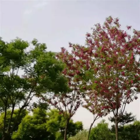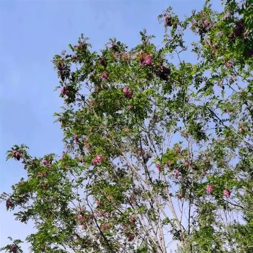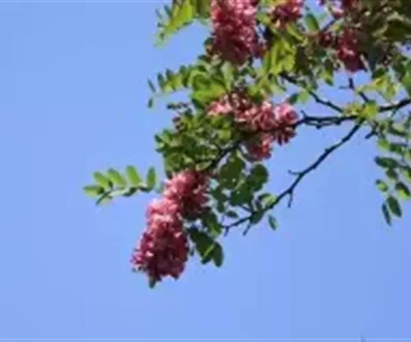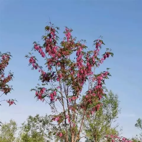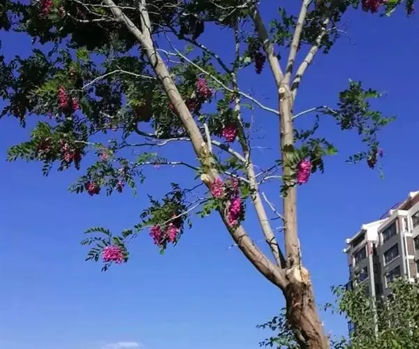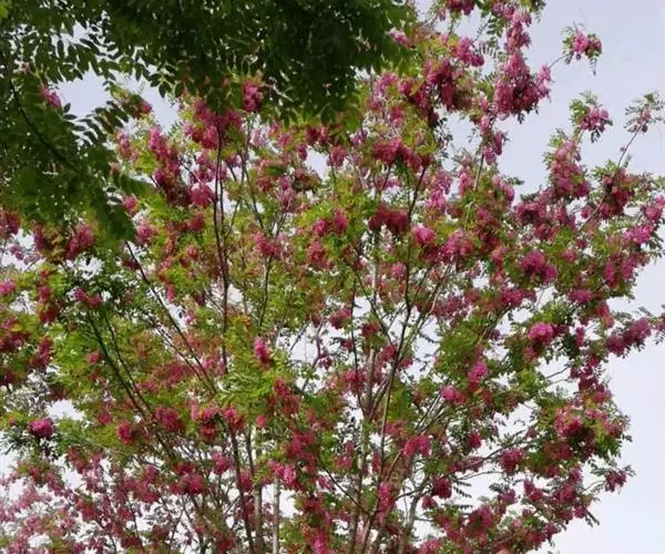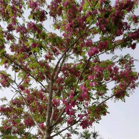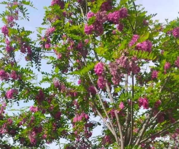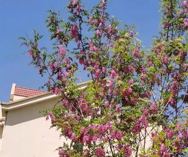 红花洋槐树体高大,叶色鲜绿,春季开花时节玫粉色花挂满枝头,芳香四溢。花为蜜源,木材质硬,耐腐。适宜庭园、道路绿化种植;也是工矿区绿化及荒山荒地造林的理想树种之一。