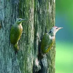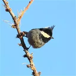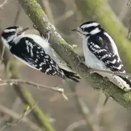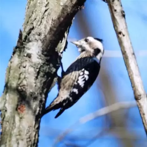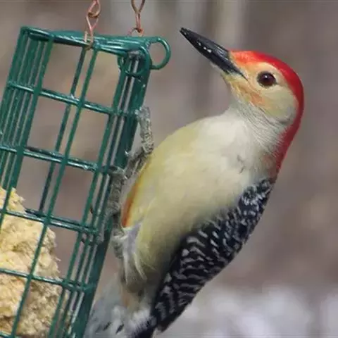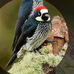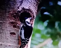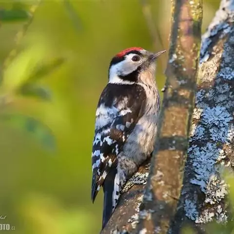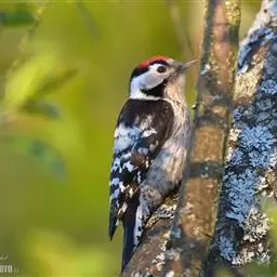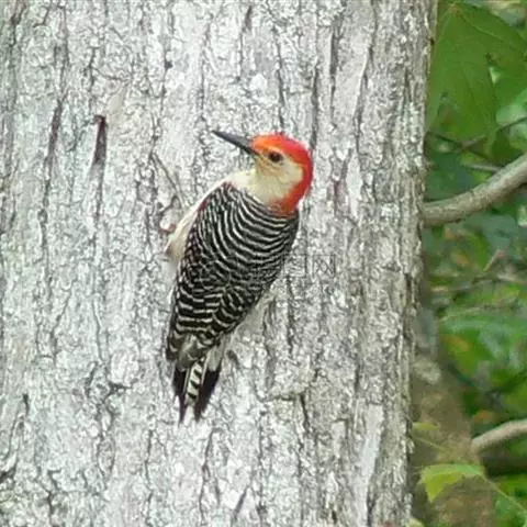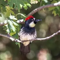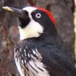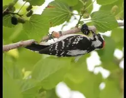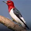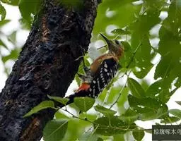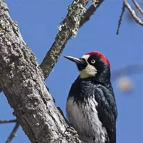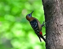 橡树啄木鸟:体长20-23厘米。前额灰黄色,头顶、后颈红色。喉下部、腰和腹部白色,…