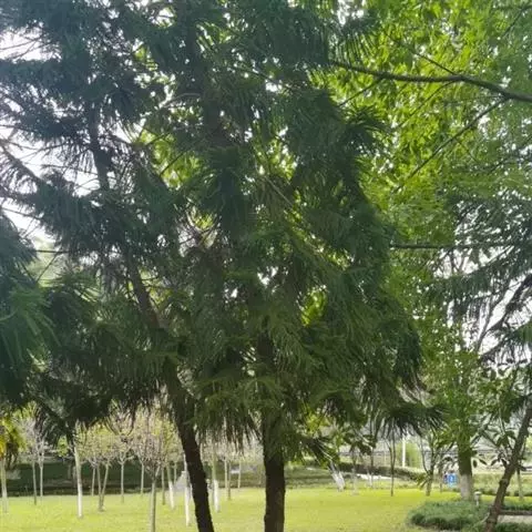 乔木,在原产地高达50米以上,胸径达1.5米;树干通直,树皮暗灰色,裂成薄片状脱落;树冠塔形,大枝平伸,长达15米以上;小枝平展或下垂,侧枝常成羽状排列,下垂。叶二型
