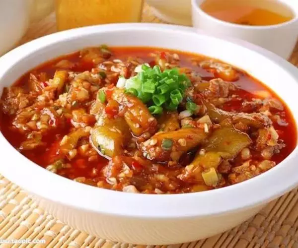 6. 随即放入肉片,再炖,肉片熟后,将肉片盛起,将剁碎的干辣椒、花椒末撒上;