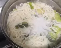 6.入鲜辣椒片翻炒均匀,加清水,盐,少量老抽煮沸。