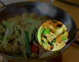 2.芹菜、蒜苗、豌 豆类可用元自菜叶代之,将元白菜撕成大片,一同下入锅内烧至入味,盖在肉片上面风味尤佳。