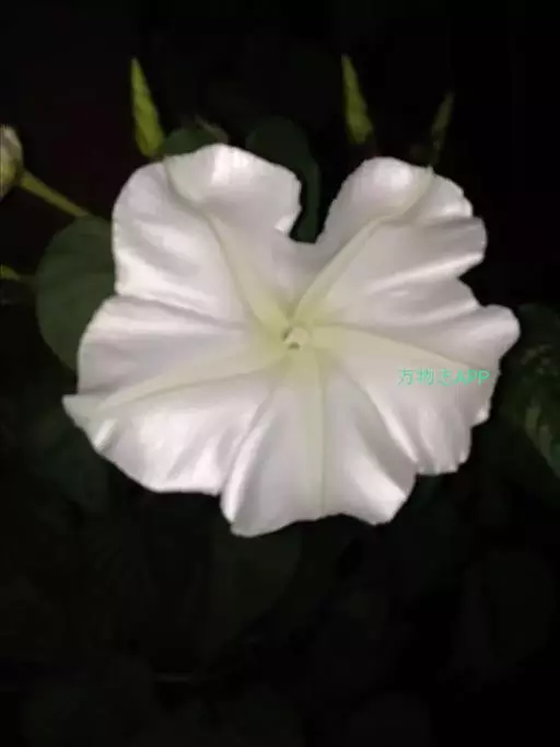 月光花(学名:Calonyction aculeatum (L.) House)是旋花科,月光花属一年生草本植物,长可达10米,有乳汁,茎圆柱形绿色,叶片卵形,先端长锐尖或渐尖,基部心形,花大,夜间开,芳香,总状,有时序轴之字曲折;萼片卵形,绿色,有长芒,内萼片芒较短或无;花冠大,雪白色,极美丽,瓣中带淡绿色,花柱和雄蕊伸出花冠外;花丝圆柱形,花药大,基部箭形,淡黄色;花盘环状,蒴果卵形,果柄粗厚。种子大,无毛。