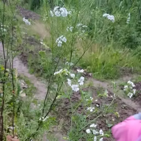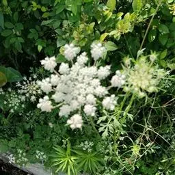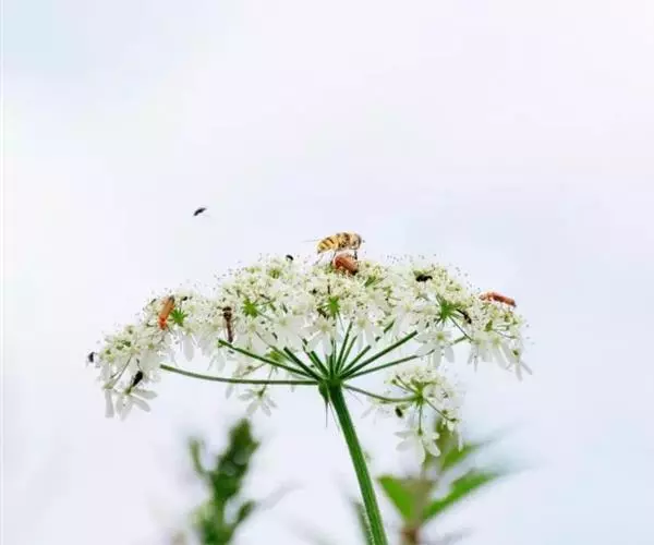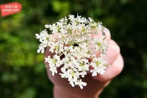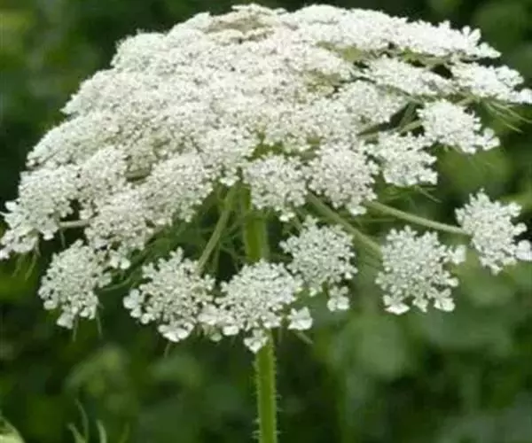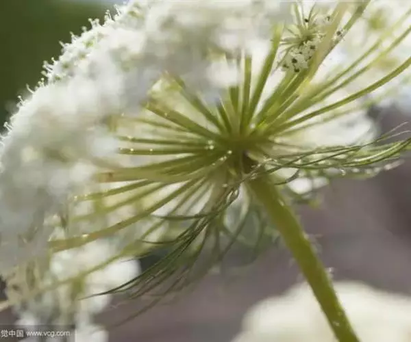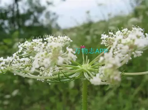 复伞形花序,花序梗长10-55厘米,有糙硬毛;总苞有多数苞片,呈叶状,羽状分裂,少有不裂的,裂片线形,长3-30毫米;伞辐多数,长2-7.5厘米,结果时外缘的伞辐向内弯曲;小总苞片5-7,线形,不分裂或2-3裂,边缘膜质,具纤毛;花通常白色,有时带淡红色;花柄不等长,长3-10毫米。果实圆卵形,长3-4毫米,宽2毫米,棱上有白色刺毛。花期5-7月。