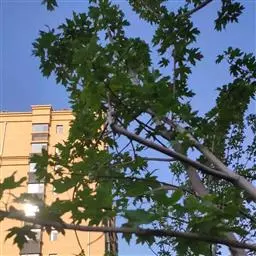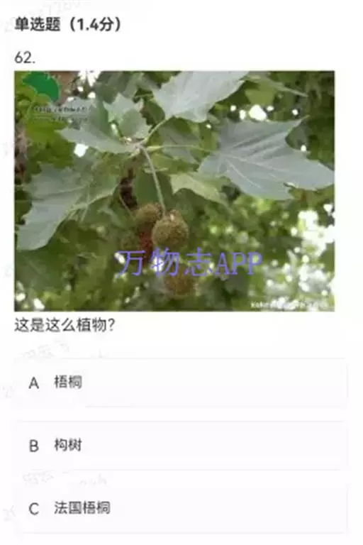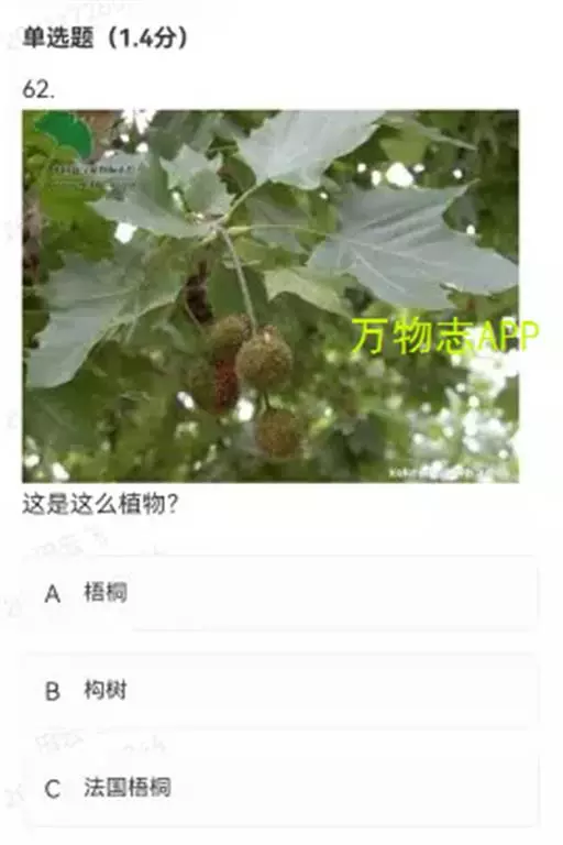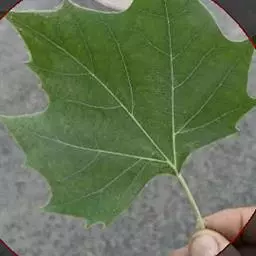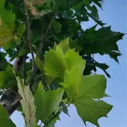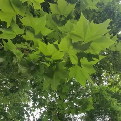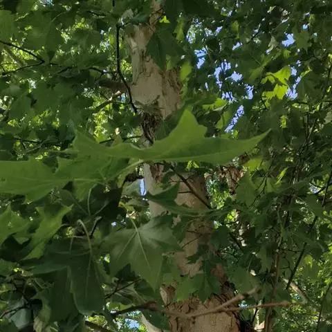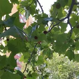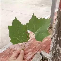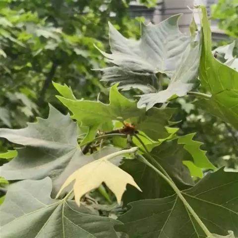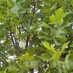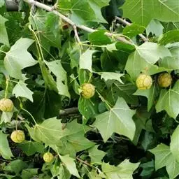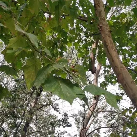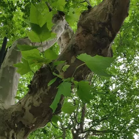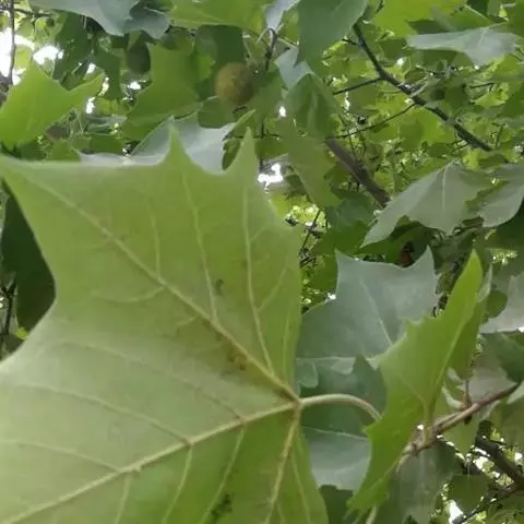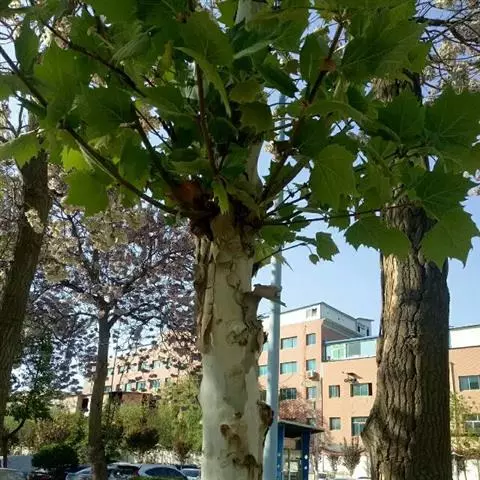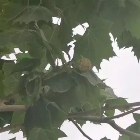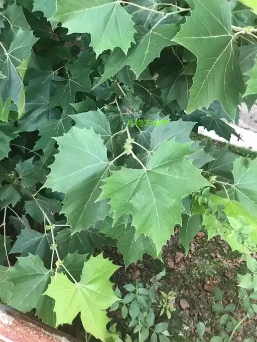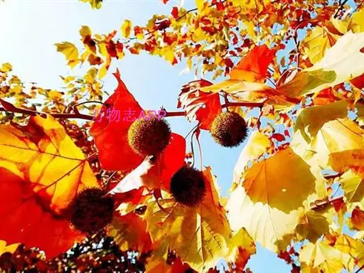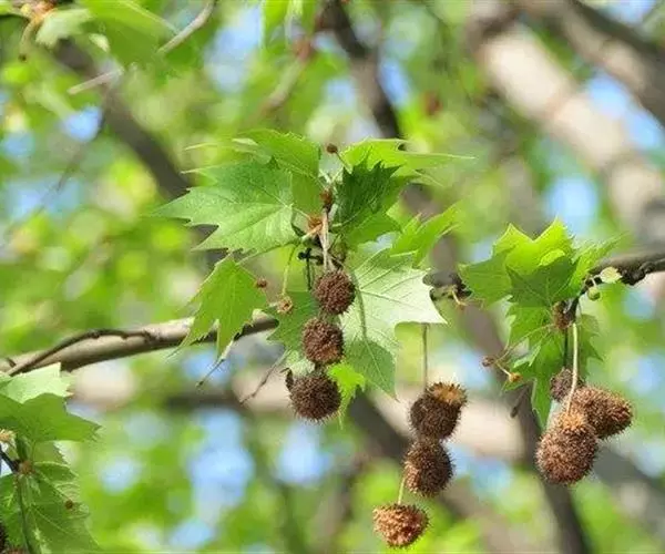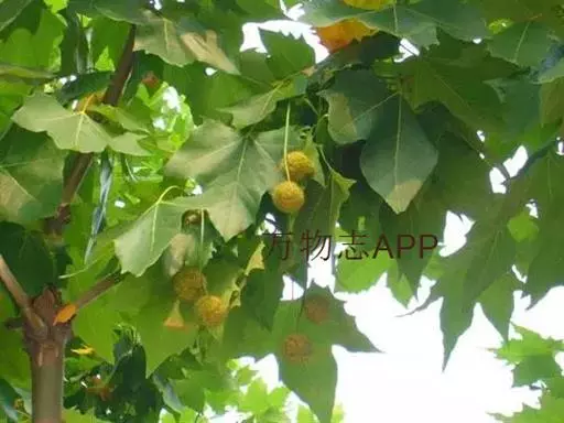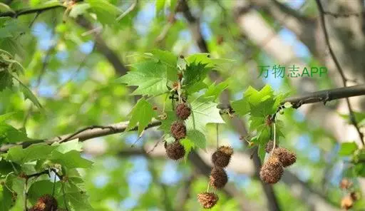 其树冠阔钟形;干皮灰褐色至灰白色,呈薄片状剥落。幼枝、幼叶密生褐色星状毛。叶掌状5-7裂,深裂达中部,裂片长大于宽,叶基阔楔形或截形,叶缘有齿牙,掌状脉;托叶圆领状。花序头状,黄绿色。多数坚果聚全叶球形,3-6球成一串,宿存花柱长,呈刺毛状,果柄长而下垂。