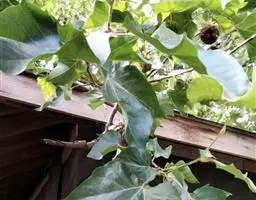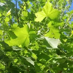 叶大,轮廓阔卵形,宽9-18厘米,长8-16厘米,基部浅三角状心形,或近于平截,上部掌状5-7裂,稀为3裂,中央裂片深裂过半,长7-9厘米,宽4-6厘米,两侧裂片稍短,边缘有少数裂片状粗齿,上下两面初时被灰黄色毛被,以后脱落,仅在背脉上有毛,掌状脉5条或3条,从基部发出;叶柄长3-8厘米,圆柱形,被绒毛,基部膨大;托叶小,短于1厘米,基部鞘状。