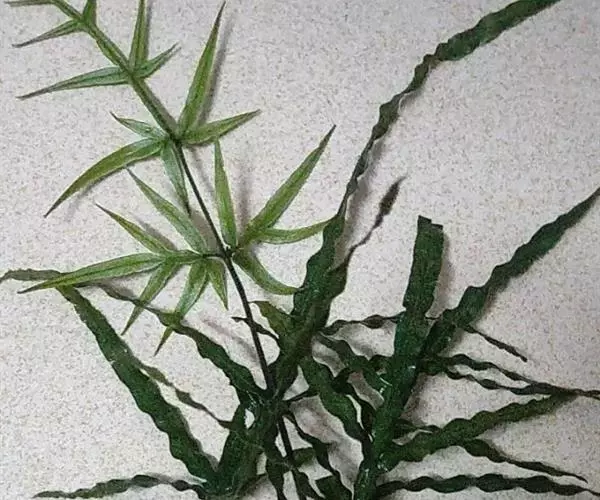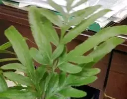 叶片卵状长圆形,长20-40厘米,宽15-20厘米,一回羽状,羽片通常3对,对生,斜向上,无柄,线状披针形,长8-15厘米,宽6-10毫米,先端渐尖,叶缘有不整齐的尖锯齿并有软骨质的边,下部1-2对通常分叉,有时近羽状,顶生三叉羽片及上部羽片的基部显著下延,在叶轴两侧形成宽3-5毫米的狭翅(翅的下部渐狭);能育叶有较长的柄,羽片4-6对,狭线形,长10-15厘米,宽4-7毫米,仅不育部分具锯齿,余均全缘,基部一对有时近羽状,有长约1厘米的柄,余均无柄,下部2-3对通常2-3叉,上部几对的基部长下延,在叶轴两侧形成宽3-4毫米的翅。主脉两面均隆起,禾秆色,侧脉明显,稀疏,单一或分叉,有时在侧脉间具有或多或少的与侧脉平行的细条纹(脉状异形细胞)。叶干后草质,暗绿色,遍体无毛;叶轴禾秆色,稍有光泽。
