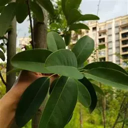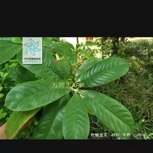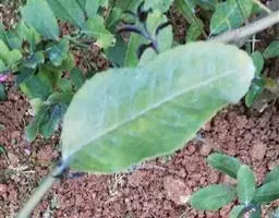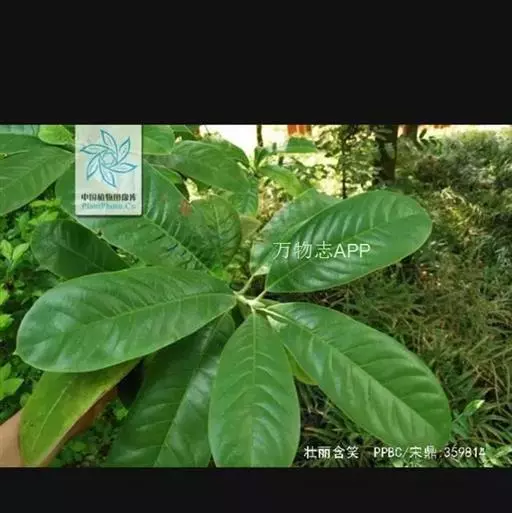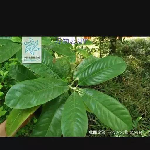 叶革质,长圆状椭圆形或椭圆形,长14-17厘米,宽6-8厘米,先端渐尖或急尖,基部宽楔形,稍下延,边缘稍反卷,两面无毛,上面光绿色,具凹入的中脉,下面暗绿色,侧脉每边15-20条,干时两面网脉均凸起;叶柄长2.5-3厘米,无托叶痕。