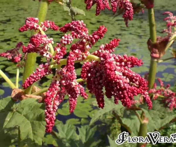 高大粗壮草本,高1.5-2米,根及根状茎粗壮木质。茎直立中空,叶片长宽近相等,长达40-60厘米,有时长稍大于宽,顶端窄渐尖或窄急尖,基部近心形,通常成掌状半5裂,每一大裂片又分为近羽状的窄三角形小裂片,基出脉多为5条,叶上面粗糙到具乳突状毛,下面及边缘密被短毛;叶柄粗壮,圆柱状,与叶片近等长,密被锈乳突状毛;茎生叶向上渐小,柄亦渐短;托叶鞘大,长达15厘米,内面光滑,外表粗糙。大型圆锥花序,分枝较聚拢,密被粗糙短毛;花小, 通常为紫红色,有时黄白色;花梗长2-2.5毫米,关节位于中部以下;花被片6, 外轮3片较窄小,内轮3片较大,宽椭圆形到近圆形,长1-1.5毫米;雄蕊9, 不外露;花盘薄,与花丝基部粘连;子房菱状宽卵形,花柱略反曲,柱头头状。果实矩圆状椭圆形到矩圆形,长8-9毫米,宽7-7.5毫米,两端均下凹,翅宽约2.5毫米,纵脉靠近翅的边缘。种子宽卵形,棕黑色。花期6月,果期8月。果期果序的分枝直而聚拢。