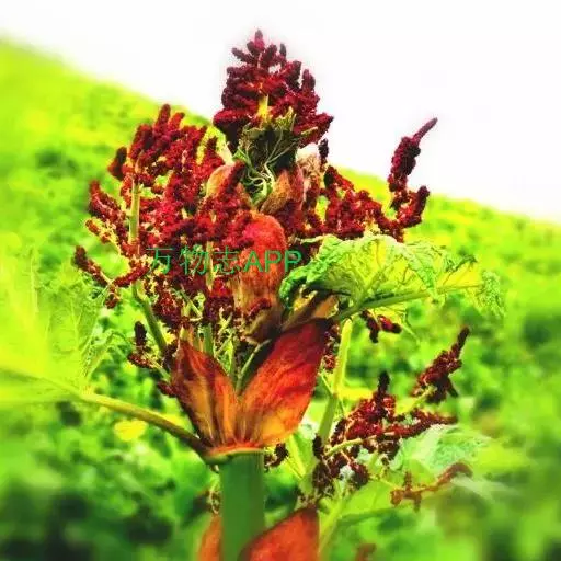 掌叶大黄(Rheum palmatum L.)蓼科,大黄属高大粗壮草本植物,高可达2米,粗壮木质根状茎。茎直立中空,叶片长宽近相等,基部近心形,叶上面粗糙到具乳突状毛,叶柄粗壮,圆柱状,与叶片近等长,托叶鞘大,内光滑,外粗糙。圆锥花序,花小, 通常紫红色,有时黄白色;花梗关节位于中部以下;花被片外轮较窄,内轮较大,宽椭圆形到近圆形,雄蕊不外露,与花丝基部粘连;子房菱状宽卵形,果实矩圆状椭圆形到矩圆形,种子宽卵形,棕黑色。6月开花,8月结果。