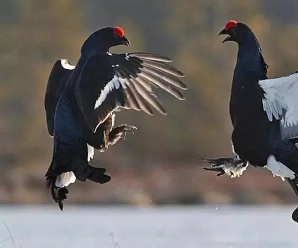 雄鸟每年4-5月都在固定的求偶场进行性表演。求偶场是在落叶松为主的森林边缘的较大的林间空地,表演主要在早、晚进行。清晨,雄鸟在其宿夜的落叶松树上不断地变换位置,断断续续地发出类似树干在大风中产生的低沉的“咯吱”鸣叫声,这种鸣叫声持续时间逐渐延长。鸣叫时,尾下垂而不张开,头、颈向上伸直,使整个身体几乎呈一条直线。10分钟后,飞向十几米远的一个隆起的空地,即求偶场。降落时发出很响的鼓翼声。落地后先观察周围的动静,而后在附近开始走动,并开始其求偶的性表演活动。这时,雄鸟的尾羽张开并向上翘起呈扇状,翅不时微张下垂,飞羽端几乎触地,走动时常触到地面的枯草,无论走动和暂停走动都很慢,始终保持着原先的姿态,头颈几乎垂直地向上翘起并前后摆动,颈部和喉部羽毛有时竖起,尾羽稍收拢,接着奔跑几步,并剧烈地鼓动翅膀,使身体几乎呈垂直状态跳离地面,高度约1米,沿山坡向下可移动5-6米。同时,发出peng-peng-peng, hua-hua-hua, dong-dong-dong等音节组成的响亮的求偶叫声。