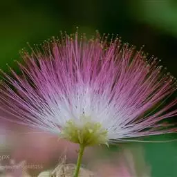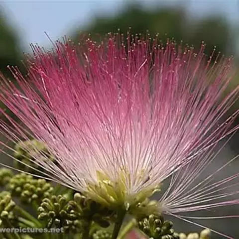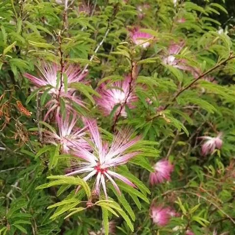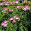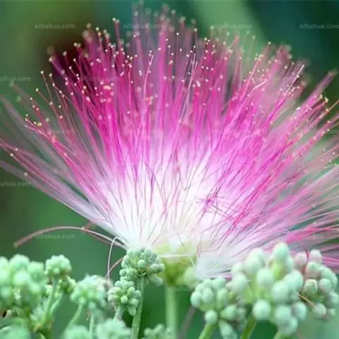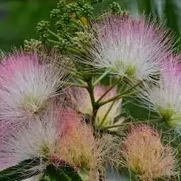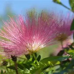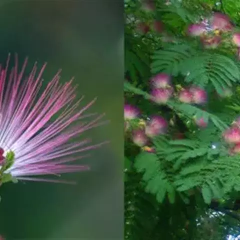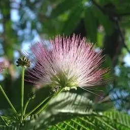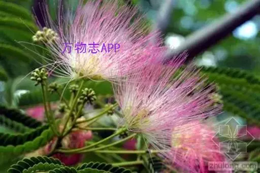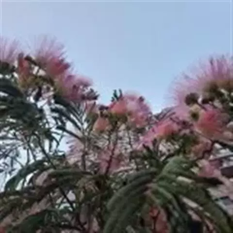 合欢(Albizia julibrissin Durazz.), 又名绒花树,马缨花。落叶乔木,夏季开花,头状花序,合瓣花冠,雄蕊多条,淡红色。荚果条形,扁平,不裂。高4-15米。树冠开展;小枝有棱角,嫩枝、花序和叶轴被绒毛或短柔毛。托叶线状披针形;头状花序于枝顶排成圆锥花序;花粉红色;花萼管状,花期6-7月;果期8-10月。