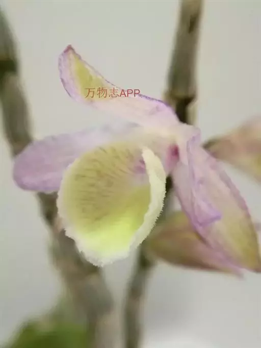 偏向石斛(D.secundum),花淡紫红色,唇瓣橙黄色。