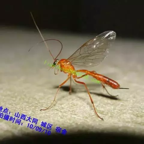 姬蜂属膜翅目姬蜂科,体长3-40毫米,黄褐色;触角细长;翅透明,前翅有两条回脉;腹部较狭长,圆筒形,…