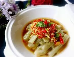 4、蕨根粉捞出放盘子内,倒入调味汁,把蒜拍碎,洒在上面即可!
