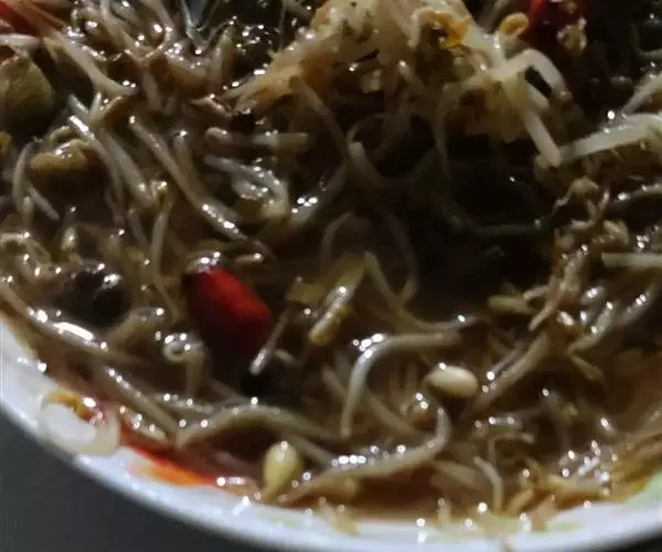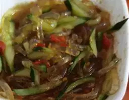 蕨根粉100g,辣椒油一大勺,醋两小勺,生抽一小勺,盐1g,青红尖椒各两个,大蒜四瓣。