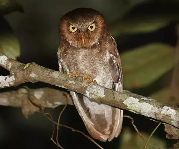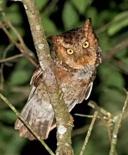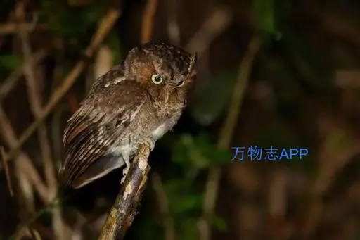 黄嘴角鸮(学名:Otus spilocephalus):小型鸟类,体长18-21厘米。的茶黄褐色角鸮。眼黄色,嘴奶油色,特征为无明显的纵纹或横斑,仅肩部具一排硕大的三角形白色点斑。主要栖息于海拔2000米以下的山地常绿阔叶林和混交林中,有时也到山脚林缘地带。夜行性,在夜晚和黄昏活动,白天多躲藏在阴暗的树叶丛间或洞穴中。以鼠类、蜥蜴、大的昆虫和昆虫幼虫为食。分布于喜马拉雅山脉、印度次大陆的东北部、中国南部、东南亚、苏门答腊及北婆罗洲。