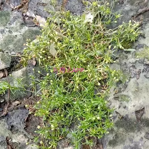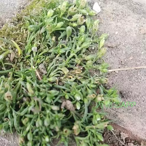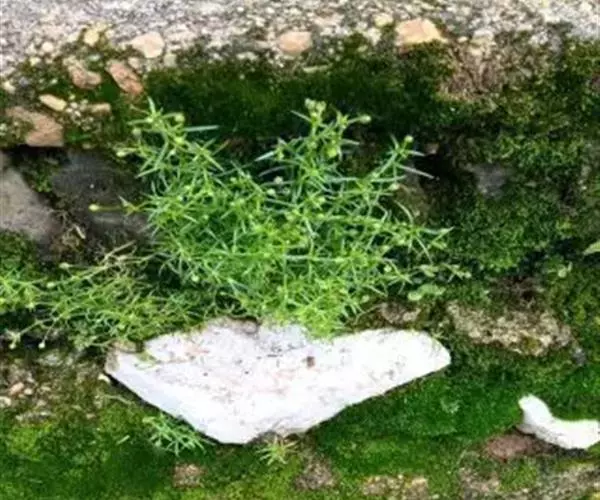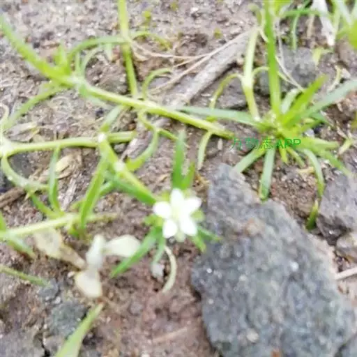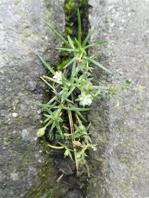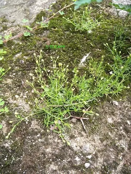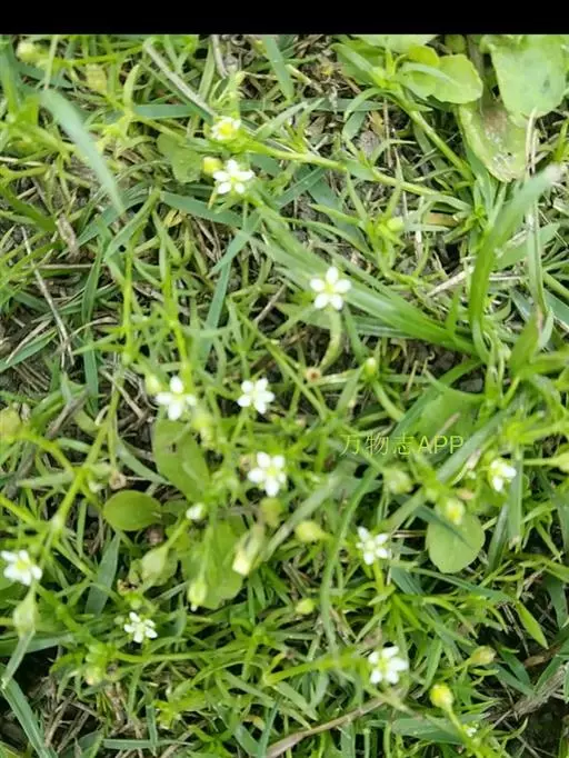 漆姑草:一年生小草本,高10-15cm。茎纤细,由基部分枝,丛生,下部平卧,上部直立,无毛或上部稍被腺毛。单叶对生;叶片线形,长5-20mm,宽约1mm,具1条脉,基部抱茎,合生成膜质的短鞘状,先端渐尖,无毛。花小形,通常单一,腋生于茎顶;花梗细小,直立,长约1-2.5cm,疏生腺毛;萼片5,长圆形乃至椭圆形,长1.5-2mm,先端钝圆,稍微呈兜状依附于成熟的蒴果,背面疏生腺毛乃至无毛,具3条脉,边缘及先端为白膜质;花瓣5,白色卵形,先端圆,长约为萼片的2/3左右;雄蕊5;子房卵圆形,花柱5。蒴果广椭圆状卵球形,比宿存萼片稍长或长出1/3左右;通常5瓣裂,裂瓣椭圆状卵形,先端钝。种子微小,褐色,圆肾形,长0.4-0.5mm,两侧稍扁,背部圆,密生瘤状突起。花期5-6月,果期6-8月。