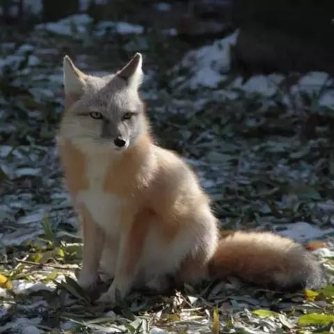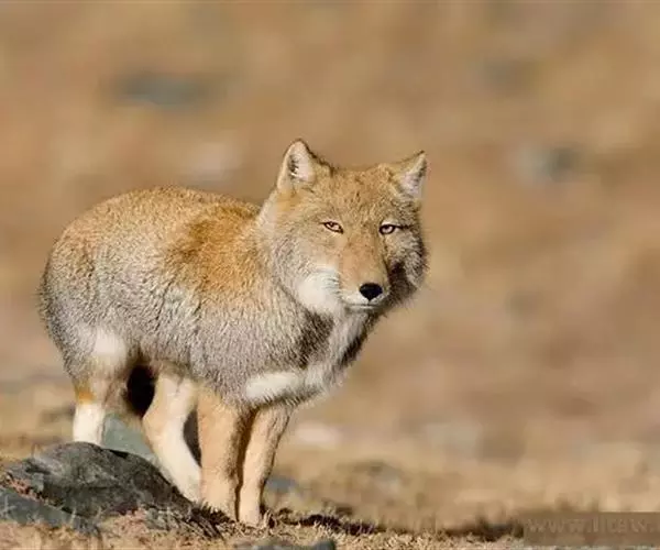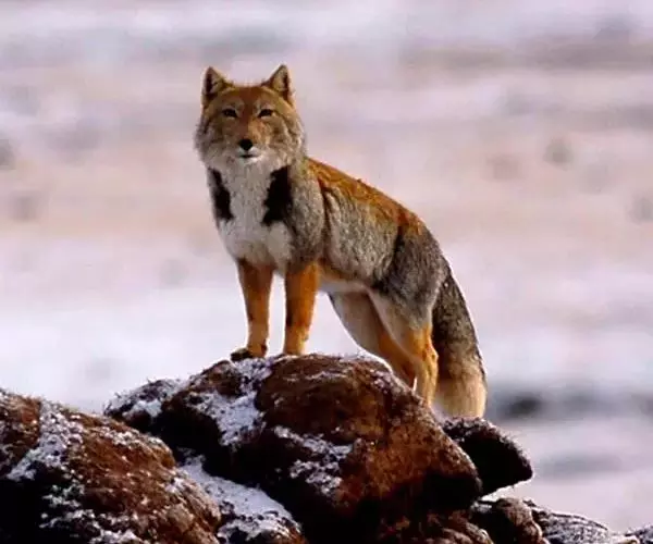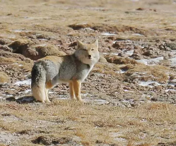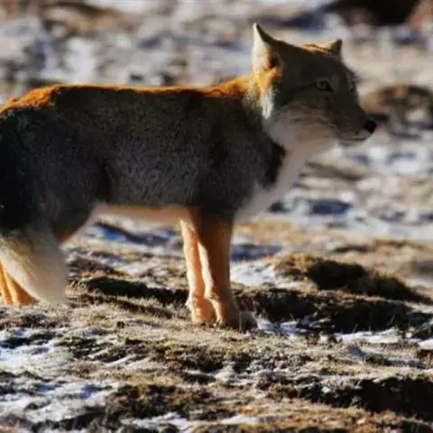 藏狐(学名:Vulpes ferrilata)大小接近赤狐或略小,但耳短小,耳长不及后足长之半,耳背之毛色与头部及体背部近似。尾形粗短,长度不及体长之半。冬毛毛被厚而茸密,毛短而略卷曲。背中央毛色棕黄,体侧毛色银灰。尾末端近乎白色。头骨之吻部十分狭长,吻部中央部位之侧缘稍向内凹入,第二前臼齿处之吻宽约为腭长之1/4。犬齿甚长,上犬齿之高约等于第四前臼齿加第一臼齿长度之总和。
